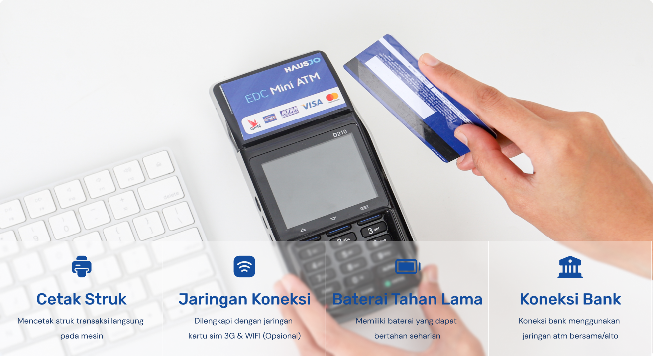 EDC Mini ATM dapat melayani penarikan tunai, transfer, cek saldo. Perangkat ini terhubung ke jaringan bank dan sistem pembayaran kartu atm, memudahkan akses keuangan di daerah.
